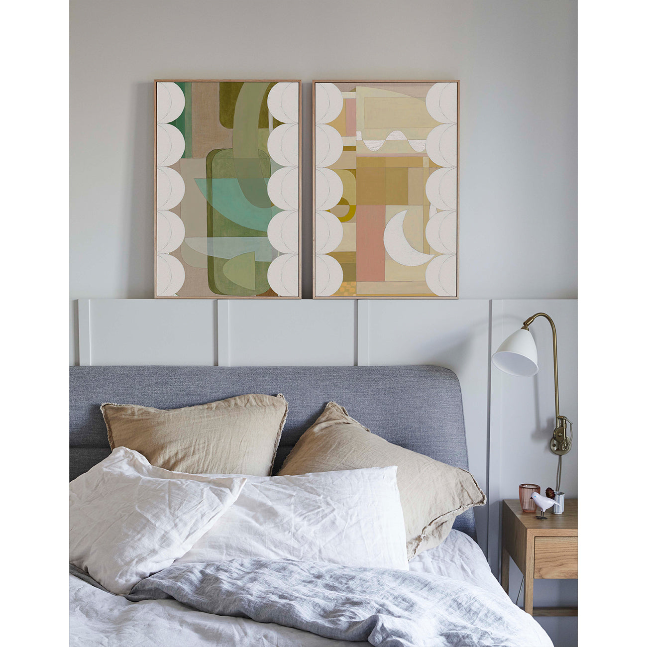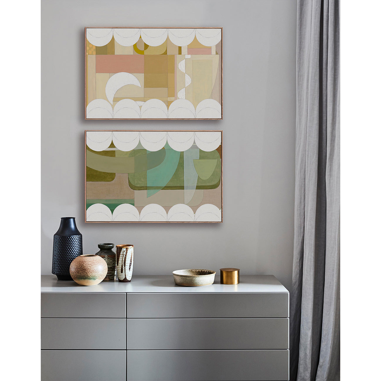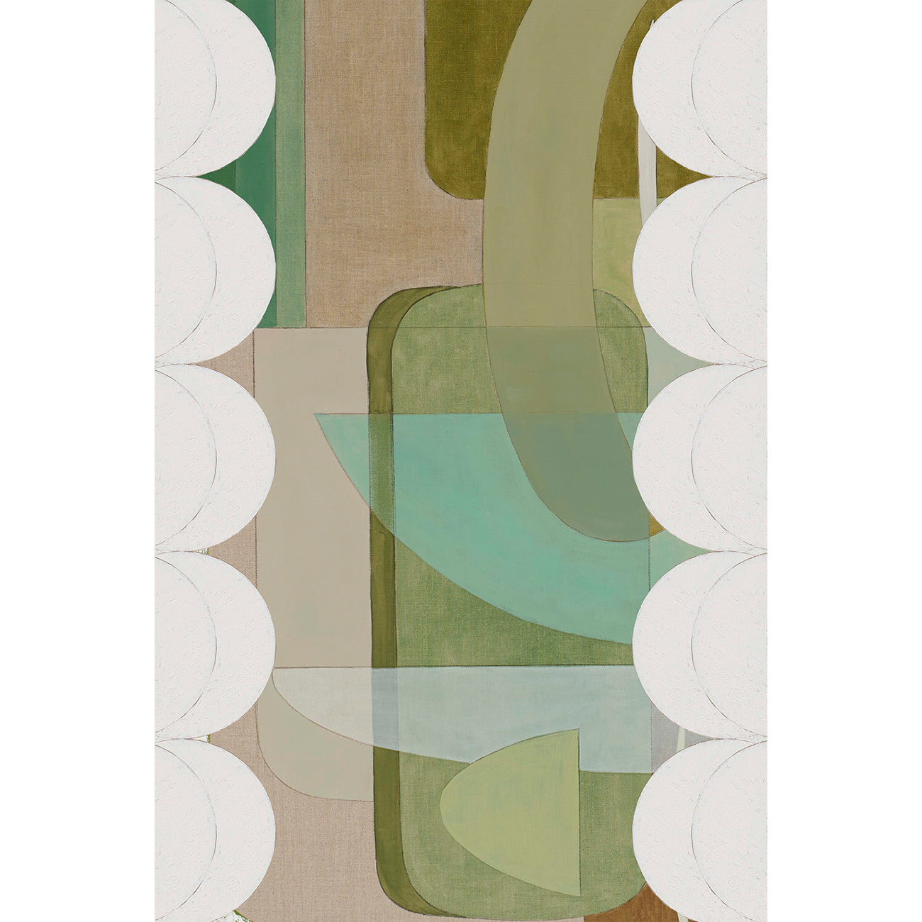 As the inaugural piece of the 'Scallop' collection, artist Tory's work showcases her exploration of geometric layers in lush tonal greens. By juxtaposing warm, almost brown hues with cool, translucent greens, she creates a peaceful and striking effect on the linen canvas. The addition of delicate white scalloping adds a refreshing touch to the overall composition.